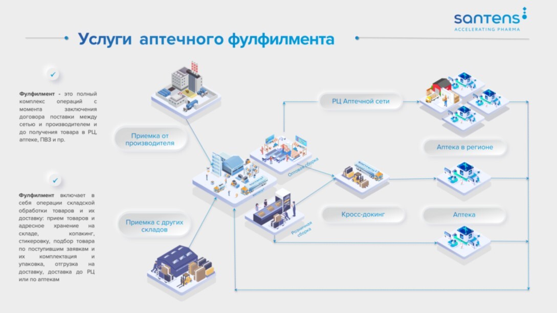 Фулфилмент включает операции складской обработки товаров и их доставку: прием и адресное хранение на складе, копакинг, стикеровку, подбор товара по поступившим заявкам и их комплектацию и упаковку, отгрузку на доставку, доставку до распределительного центра или аптек. География доставок — от Калининграда до Владивостока.